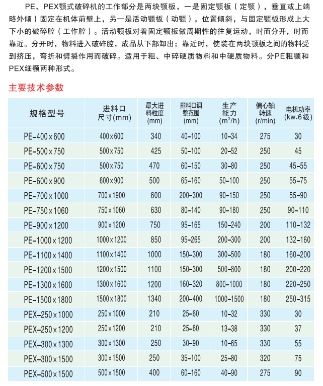 產(chǎn)品簡介PEX型顎式破碎機(jī)是出現(xiàn)較早的破碎設(shè)備,因其構(gòu)造簡單、堅固、工作可靠、維護(hù)和檢修容易以及生產(chǎn)和建設(shè)費(fèi)用比較少,因此,直到現(xiàn)在仍然廣泛地在冶金、化工、建材、電力、交通等工業(yè)部門。(注:PE為粗顎式破碎機(jī),PEX為細(xì)顎式破碎機(jī)。)
